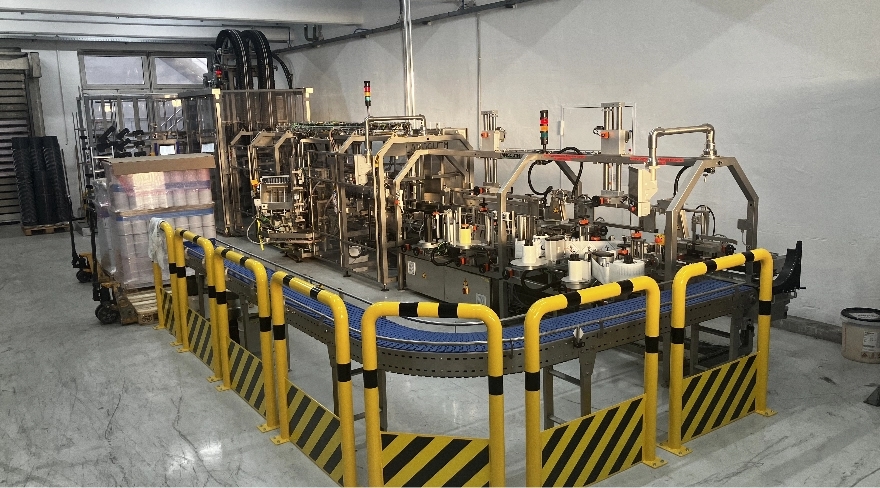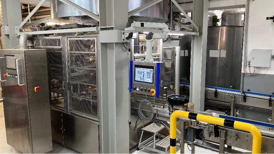 Automatisch befüllen und Deckel drauf: Die Eimerfüll- und -verschließmaschine füllt und verdeckelt bis zu acht Eimer pro Minute vollautomatisch.