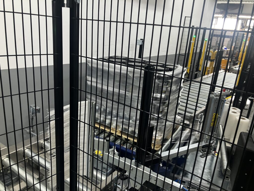 Automatisch folieren: Die fertig bestückten Paletten werden versandtauglich mit einer Folie umwickelt.