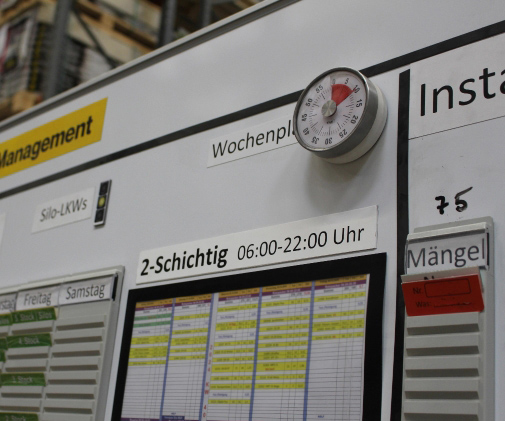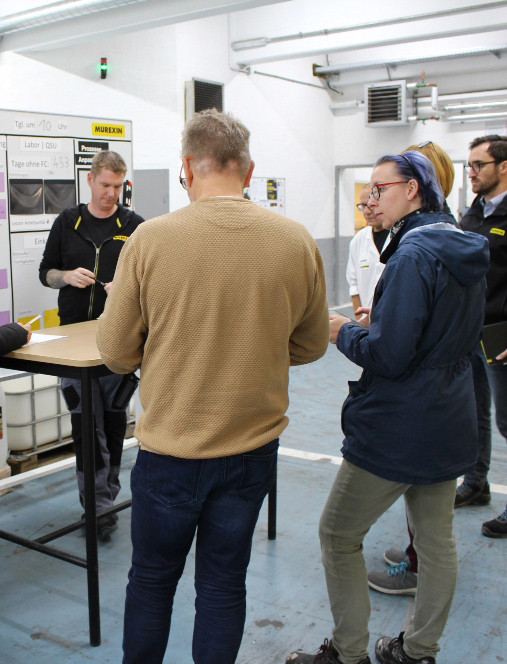 Murexin nennt diese neuen Treffen „Shopfloor-Meetings“. Die Besprechung findet dort statt, wo das, worüber man spricht, auch passiert. Täglich reden Mitarbeiter der unterschiedlichen Abteilungen maximal 10 Minuten über Verfügbarkeiten, Liefertermine und die Qualität der Rohstoffe direkt in der Nass- und Pulverproduktion. Danach weiß jeder, was zu tun ist, und kann sich gleich wieder den Kundenaufträgen widmen. Auf diese Weise gelingt es, auf Probleme schnell zu reagieren oder im Idealfall diese zu erkennen, bevor sie entstehen.