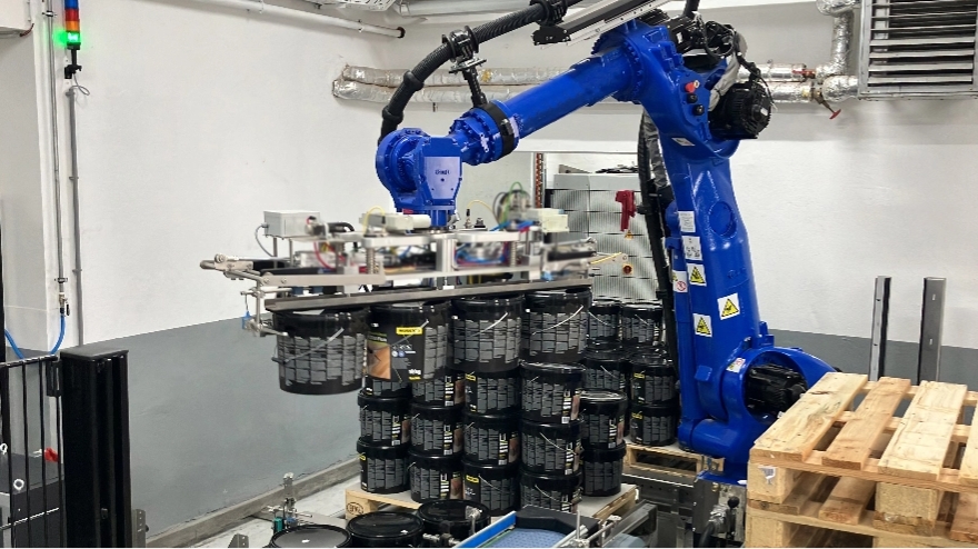 Der Roboter arbeitet mit: Er stapelt die abgefüllten Eimer zweier Produktionslinien parallel auf zwei Palettierplätzen.
